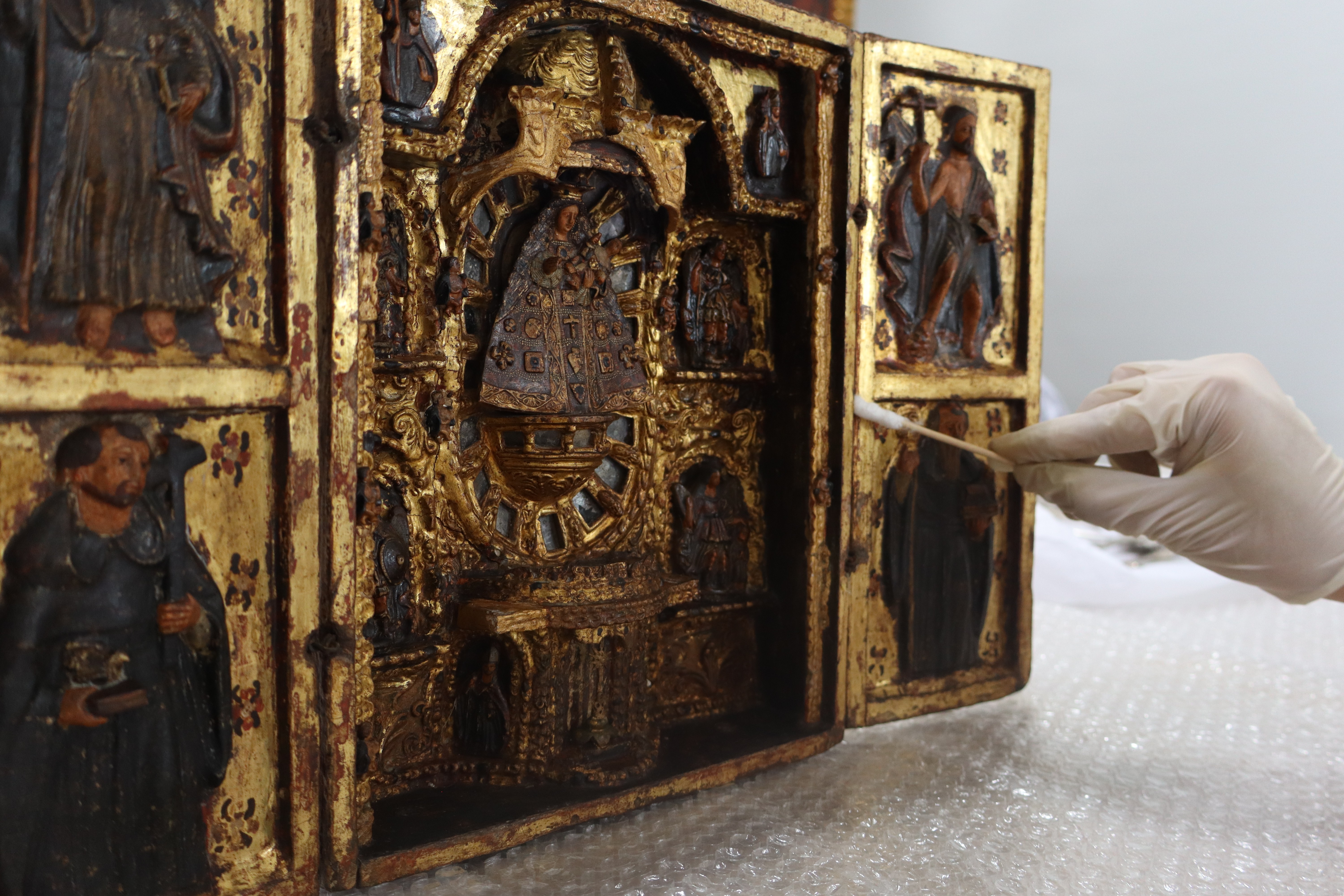 Entre las más de 50 piezas en exhibición, destacan 19 obras inéditas sometidas a rigurosos procesos de investigación y restauración, y reliquias de valor excepcional. Una de las piezas centrales que recibe al público es el manto y escapulario de la Virgen de la Puerta de Otuzco, bordado con hilos plateados y dorados y exhibido en Lima por primera vez como símbolo vivo de devoción popular.